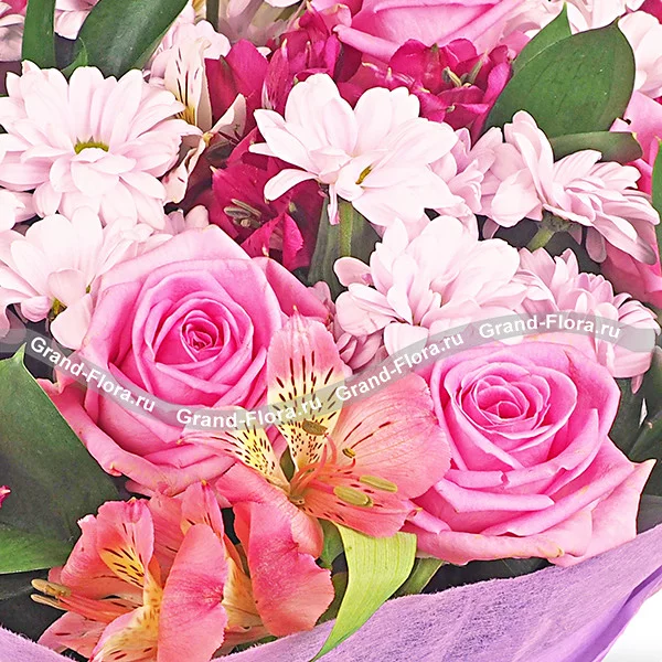Люкс (на фото): роза розовая - 7 шт, хризантема кустовая светло-фиолетовая (возможна замена на белую) - 4 шт., альстромерия яркая - 3 шт, альстромерия розовая - 1 шт., упаковка, лента