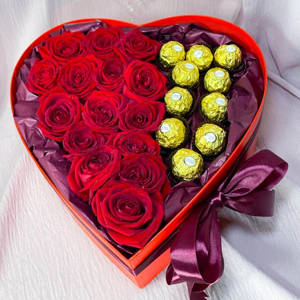 Коробка в форме сердца с наполнением из живых роз и сладостей сочетает в себе все атрибуты подарка, Вам больше не надо искать, что подарить дорогому человек, так как эта композиция отвечает всем требованиям.